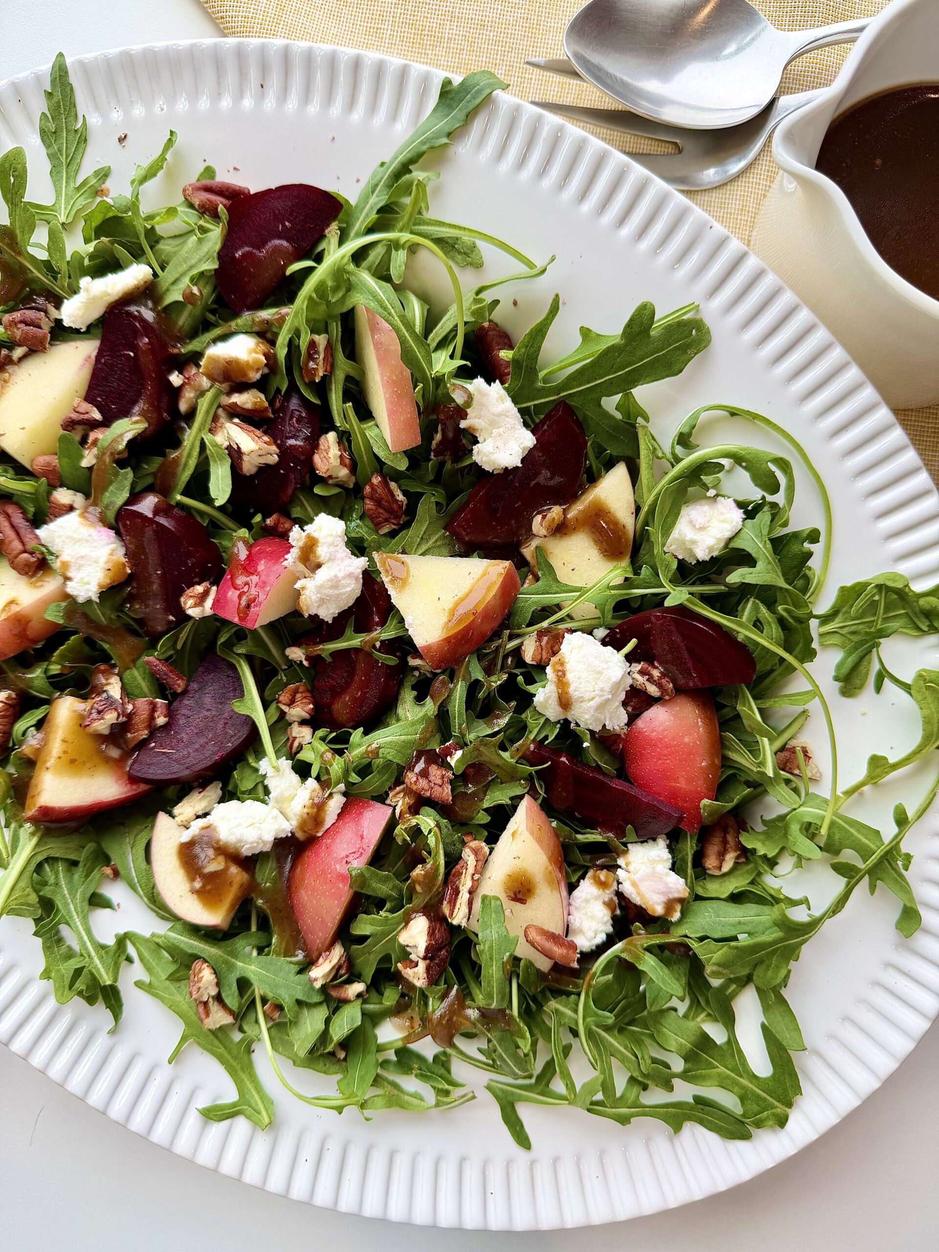 A fresh, nutrient-dense arugula beet salad layered with roasted beets, toasted pecans, and crumbled goat cheese, all drizzled with a bright balsamic vinaigrette. This wholesome, energy-boosting salad is perfect for lunch or a light dinner — simple, satisfying, and full of real-food flavor.