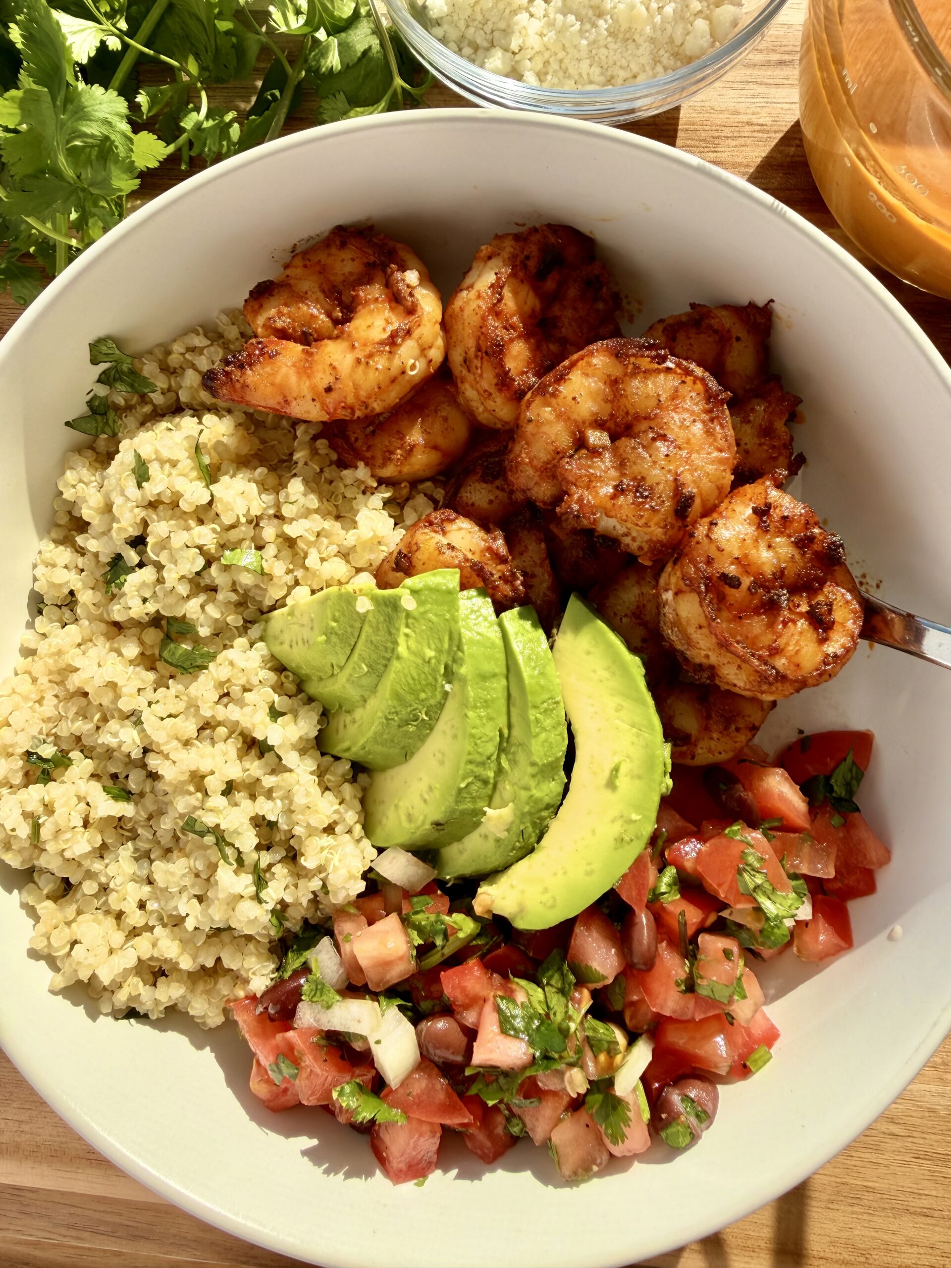 Smoky chili-lime shrimp, fluffy lime-cilantro quinoa, homemade Pico folded with black beans, creamy chipotle ranch, and avocado—fresh, filling, and seriously flavor-packed.