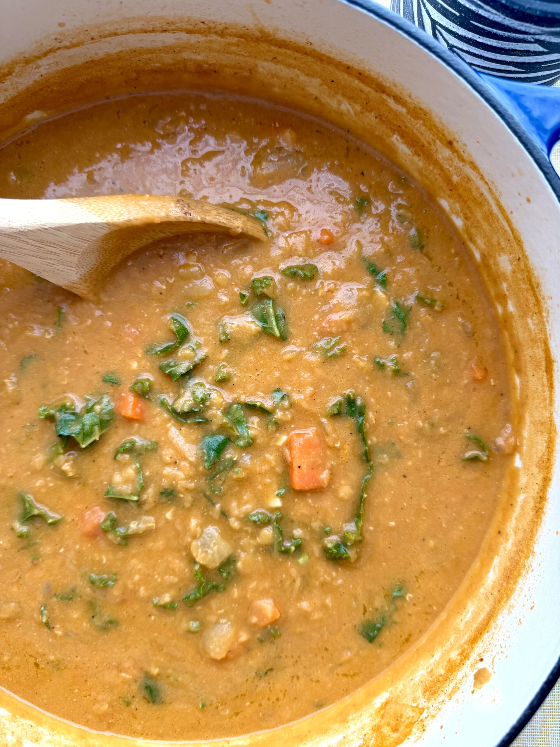 Naturally creamy red lentil soup with caramelized tomato paste, cumin, carrots, and kale—finished with lemon and cilantro for a bright, energizing bowl.